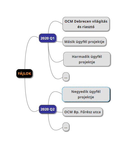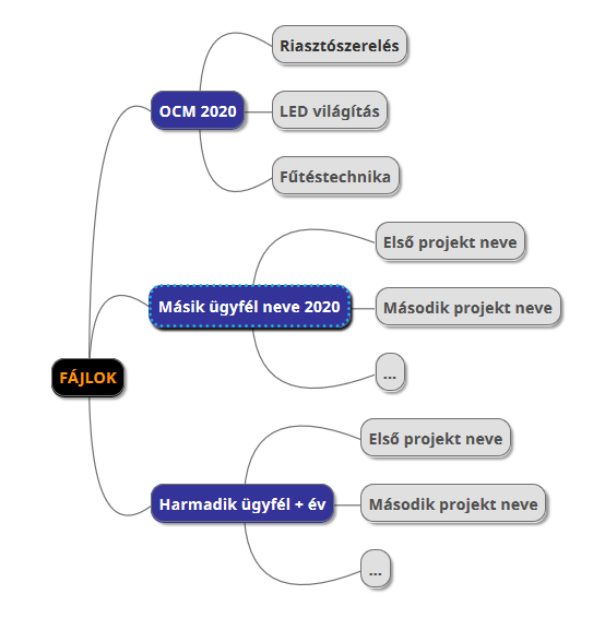 Ha a projektjeinket tudjuk tipizálni, ám nagyszámú ügyfélkörnek dolgozunk és mindig újabb és újabb ügyfelek rendelnek meg projekteket, akkor célszerű a főkönyvtárak esetében a projekt típusával és az évszámokkal operálni, az alkönyvtárak neve lehet az ügyfél neve és alternatívaként a helyszín.