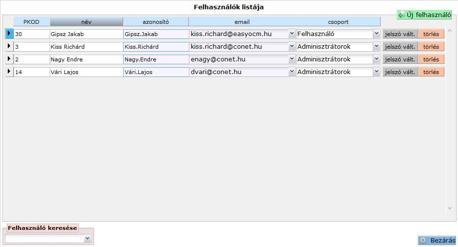 A listasoros űrlapon alapértelmezésben egy éles rendszerben csak egy felhasználó szerepel a listában, mi magunk, azaz az adminisztrátor. A demó rendszerben néhány példaértékű felhasználót találunk.