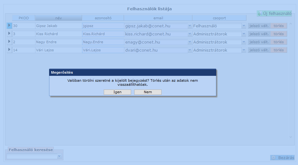 Ha egy felhasználót el szeretnénk távolítani a rendszerből, kattintsunk a sorában a piros 'Törlés' gombra.