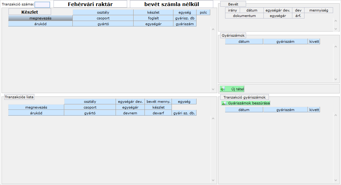 - A bal felső panelen az éppen bevételezett árucikkek tranzakció után listáját, az aktualizált készletmennyiségekkel.