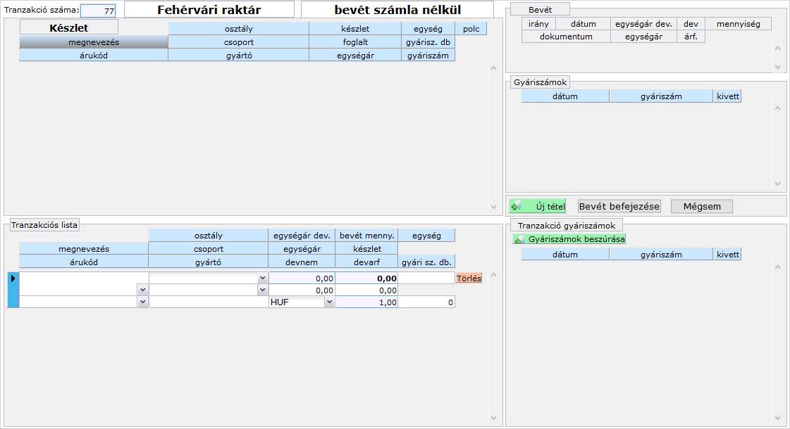 - A tranzakciós lista és a gyári számok beszúrása panel üres lesz.