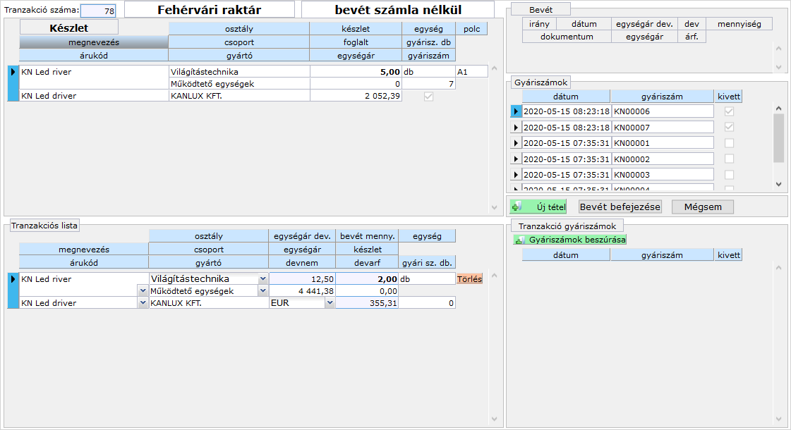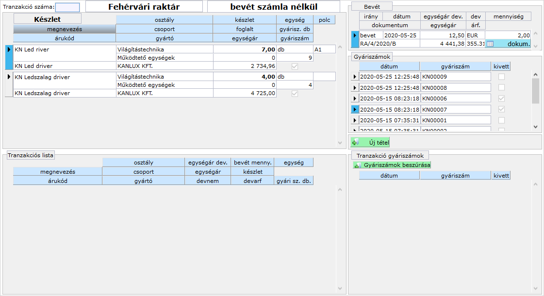 Az űrlapon a bal alsó, Tranzakciós listában kijelölt árucikkhez kapcsolódó gyári számokat kezelhetjük a jobb alsó panelen.